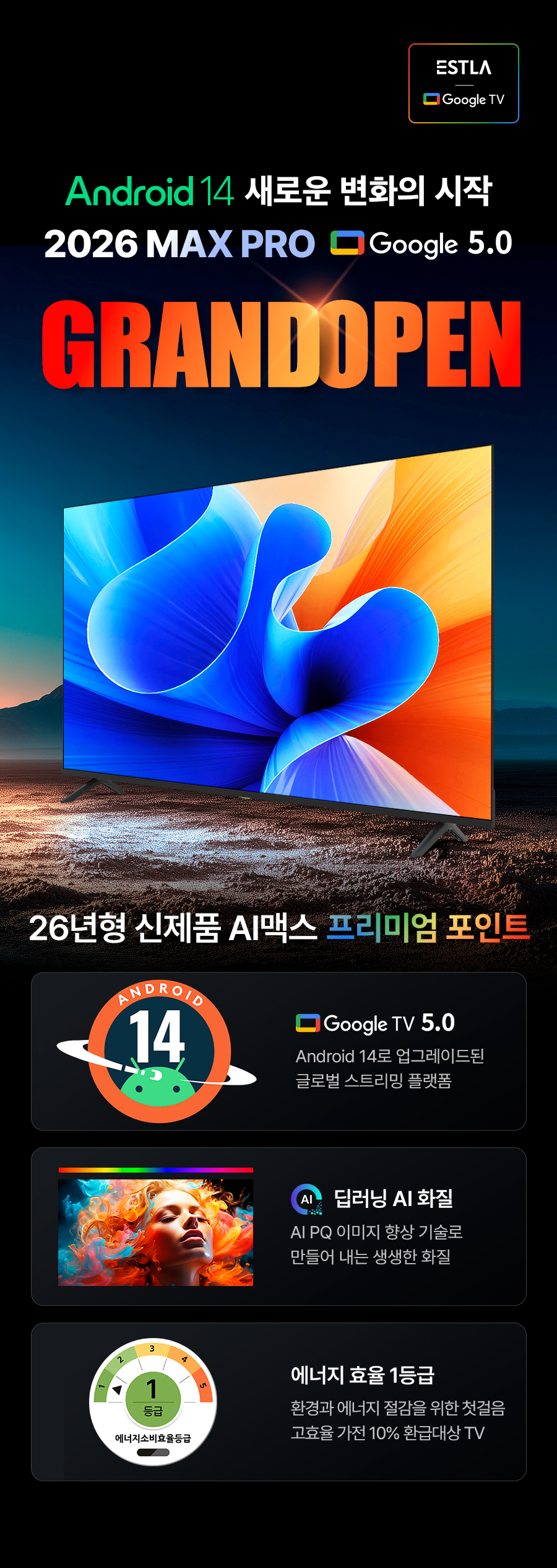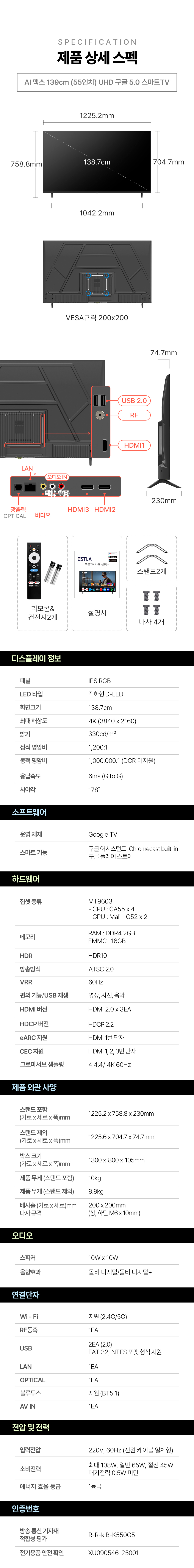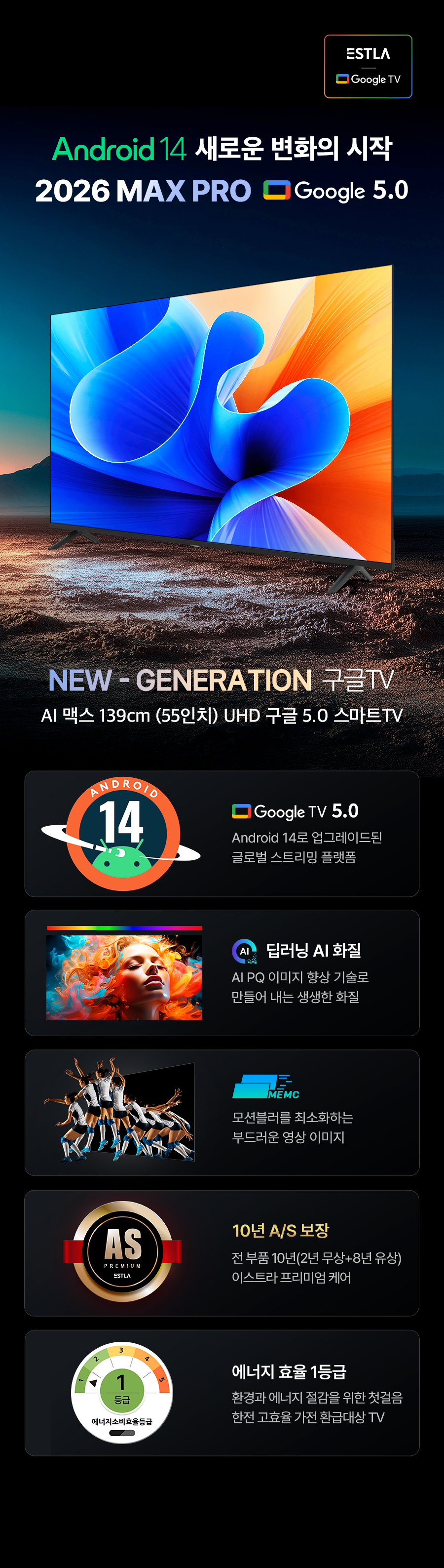 [으뜸효율 10% 환급대상] 10년AS보장 이스트라 1등급 60Hz AI 맥스 55 UHD 구글 5.0 스마트TV