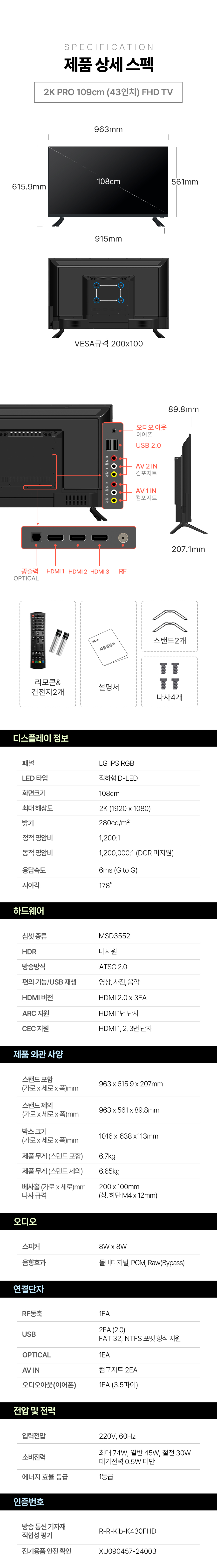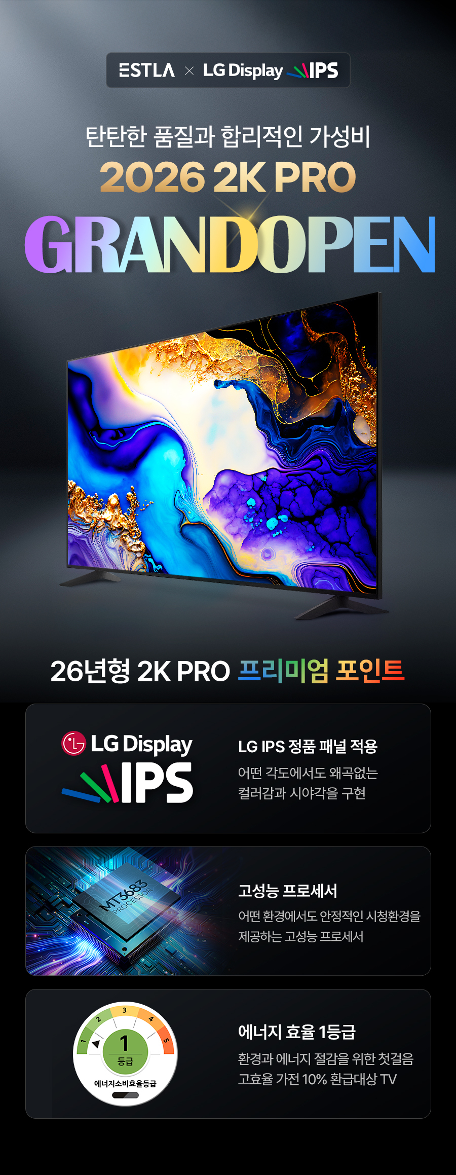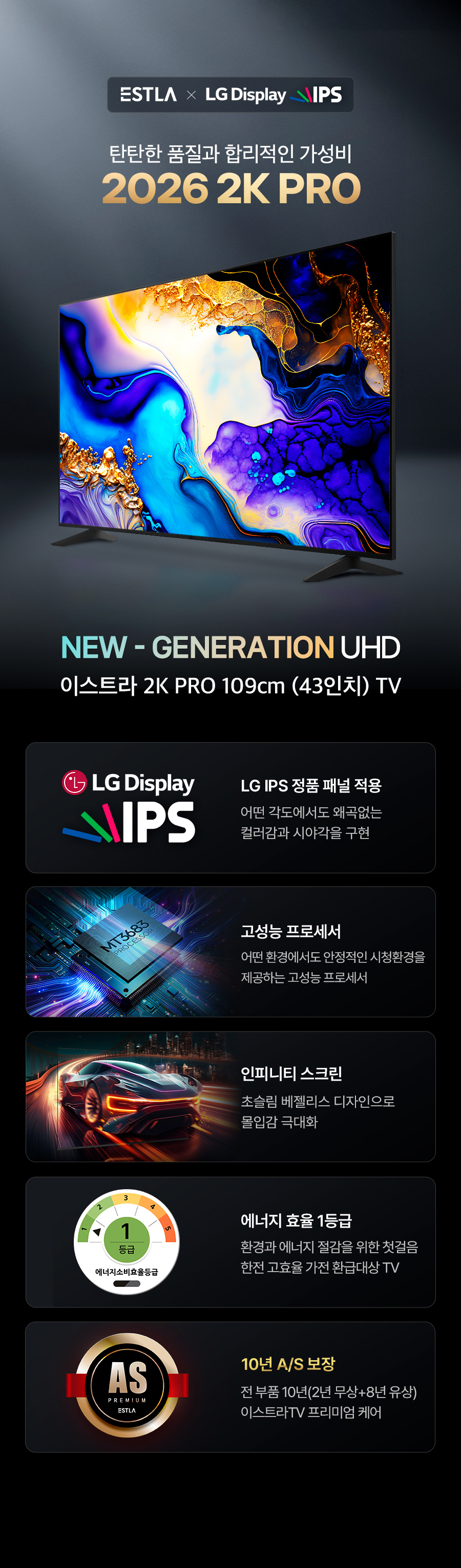 26년형 신제품 LG IPS 정품패널 탑재 1등급 이스트라 2K PRO 109cm(43인치) FHD 제로베젤 TV